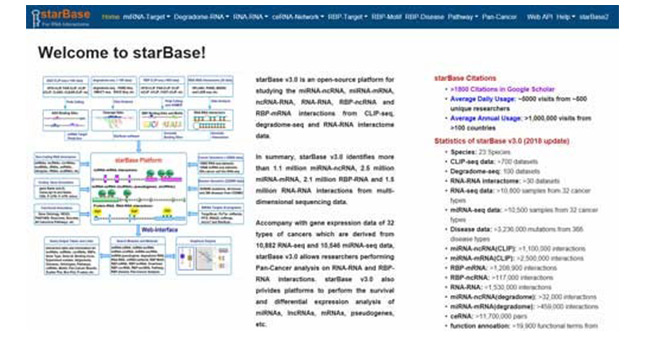 starBase(http://starbase.sysu.edu.cn/)是一個(gè)開源平臺,用于研究CLIP中的 miRNA-ncRNA、miRNA-mRNA、ncRNA-RNA、RNA-RNA、RBP-ncRNA和RBP-mRNA相互作用。目前, starBase已從多維測序數(shù)據(jù)中鑒定了超過110萬個(gè)miRNA-ncRNA,250萬個(gè)miRNA-mRNA,210萬 個(gè)RBP-RNA和150萬個(gè)RNA-RNA的相互作用。