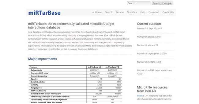 miRTarBase(http://mirtarbase.mbc.nctu.edu.tw/php/index.php)是經(jīng)過實(shí)驗(yàn)驗(yàn) 證的microRNA-target相互作用數(shù)據(jù)庫。目前為止,miRTarBase的miRNA-target相互作用 (MTIs)數(shù)已經(jīng)累計(jì)超過三十六萬。