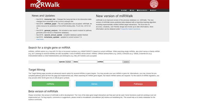 miRWalk(http://mirwalk.umm.uni-heidelberg.de/)是一個(gè)綜合性數(shù)據(jù)庫,可 提供已驗(yàn)證和預(yù)測的miRNA結(jié)合位點(diǎn)信息,涉及種屬包括人類、小鼠和大鼠。另外,miRWalk 還整理了miRNA相關(guān)靶標(biāo)的所有信息。