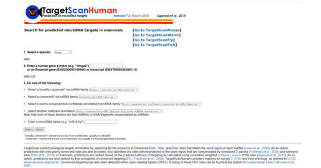 TargetScan(http://www.targetscan.org/vert_72/)通過搜索是否存在與每個(gè) miRNA的種子區(qū)域匹配的保守8聚體、7聚體和6聚體位點(diǎn)來預(yù)測miRNA的靶點(diǎn)。