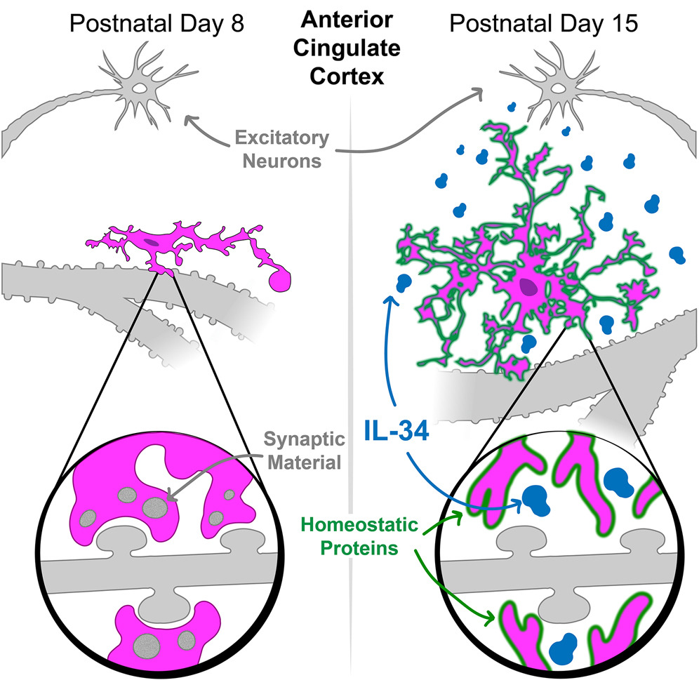 杜克大學Staci D. Bilbo團隊在《Immunity》發(fā)表研究,揭示神經(jīng)元來源的白細胞介素-34(IL-34)在小鼠前扣帶回皮層(ACC)發(fā)育中調(diào)控小膠質(zhì)細胞成熟與突觸修剪的關(guān)鍵作用。研究發(fā)現(xiàn),IL-34在出生后第二周顯著上調(diào),主要由興奮性神經(jīng)元表達,其缺失會導致小膠質(zhì)細胞數(shù)量減少、成熟標志物TMEM119表達降低,并異常增加突觸吞噬。急性阻斷IL-34會重新激活突觸修剪,而過表達IL-34則抑制這一過程。此外,IL-34缺失小鼠表現(xiàn)出焦慮樣行為減少和認知靈活性缺陷。該研究將IL-34確定為神經(jīng)元與小膠質(zhì)細胞“對話”的關(guān)鍵介質(zhì),為神經(jīng)發(fā)育疾病提供了新的干預(yù)靶點。