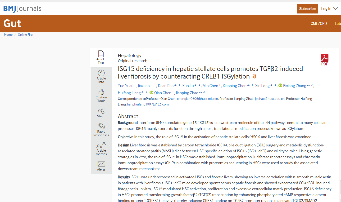 [2]ISG15 deficiency in hepatic stellate cells promotes TGFβ2-induced liver fibrosis by counteracting CREB1 ISGylation.Gut,2025 Aug 17