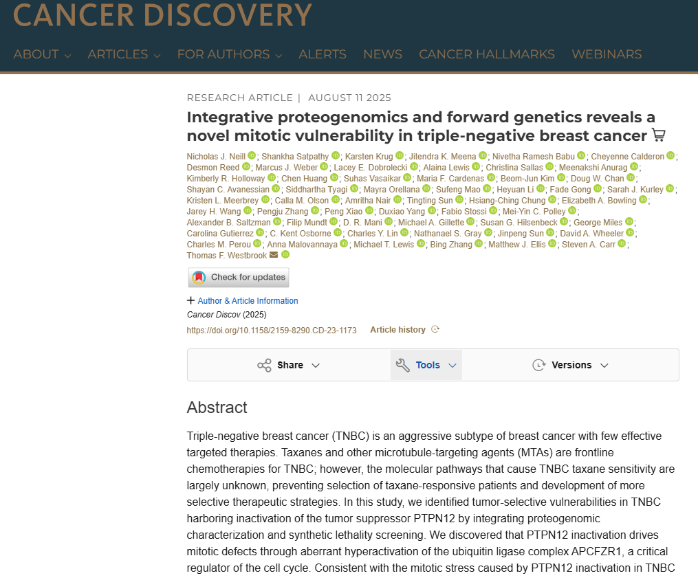 [7]Integrative proteogenomics and forward genetics reveals a novel mitotic vulnerability in triple-negative breast cancer.Cancer Discov,2025 Aug 11