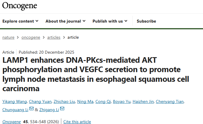 [4]LAMP1 enhances DNA-PKcs-mediated AKT phosphorylation and VEGFC secretion to promote lymph node metastasis in esophageal squamous cell carcinoma.Oncogene,2026 Feb