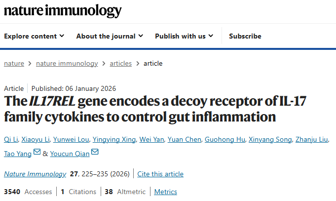 來源:The IL17REL gene encodes a decoy receptor of IL-17 family cytokines to control gut inflammation.Nat Immunol,2026 Feb