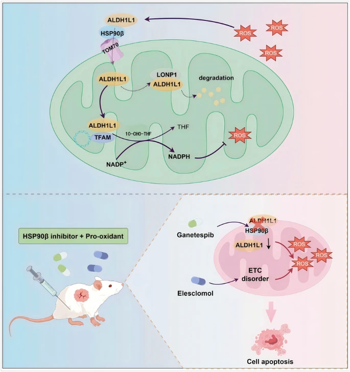 邢金良/任婷婷團隊2026年1月在《Cell Death & Differentiation》報道,ROS升高時胞質代謝酶ALDH1L1經(jīng)二硫鍵構象改變,被HSP90β-TOM70軸導入線粒體,與TFAM共定位并高效生成NADPH,維持線粒體氧化還原穩(wěn)態(tài),使高表達腫瘤耐受促氧化治療;低表達腫瘤則易在低劑量ROS下凋亡。聯(lián)合HSP90抑制劑阻斷ALDH1L1轉位可顯著增敏Elesclomol,為“精準氧化療法”提供生物標志物及新靶點。