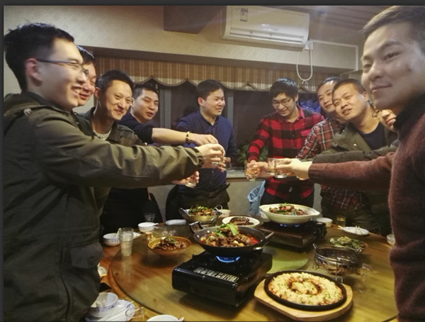 咱們大家一番熱火朝天地相互嘮嗑,上菜還比較快,感覺刷一下子都差不多上齊了。邊吃邊聊天,還時不時的舉杯,預(yù)祝明年再次相聚公司發(fā)展越來越好!慶祝這次聚會的難得與喜悅!咱們部門喝酒,提倡量力而行,大家各自都盡興。好飲酒的會相互比拼,喝盡興,部門經(jīng)理在合適機會就陪他們一起盡興,不好飲酒者量力而行就好,不能飲酒者以茶代酒隨自己心意,無需拘束。部門經(jīng)理對大家比較突出的表現(xiàn)各自一一提出了表揚以及慰問,還激勵各工程師之間的優(yōu)勢日后可多交流,相互成長,一起努力打造我們更好的團隊。自稱“一直喝”的柳圣松是啤酒擔(dān)當(dāng),比較能喝白酒的向成是白酒擔(dān)當(dāng)……作為部門唯一的女同事,我通常就是好奇地聽著、盡情吃、歡樂地笑就好,還有重要的一事那就是至美一拍,留下這美好歡樂的瞬間當(dāng)然是少不了的!