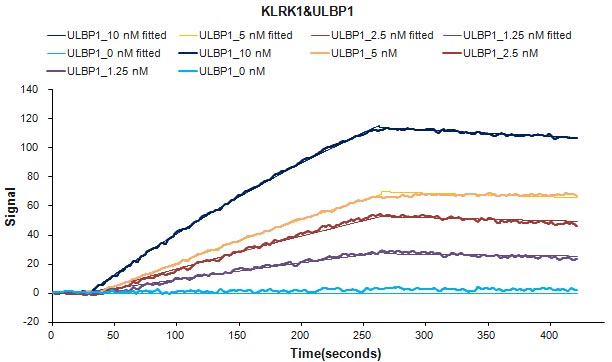 Human KLRK1 protein Fc tag (CSB-MP012474HU1) captured on COOH chip can bind Human ULBP1 protein Fc/myc tag (CSB-MP887177HU) with an affinity constant of 2.27 nM as detected by LSPR Assay.