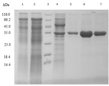 難點(diǎn):酵母胞內(nèi)表達(dá),破菌后純化,可以看出裂解液中雜蛋白非常多(泳道1),目的蛋白非常不明顯,經(jīng)過(guò)酵母系統(tǒng)特有的層析系統(tǒng)一次純化,用SDS-PAGE檢測(cè)看不到雜帶,純度達(dá)到95%以上(泳道6-7)。