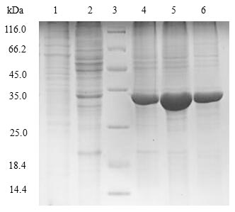 采用桿狀病毒-昆蟲細(xì)胞表達(dá)系統(tǒng),該蛋白得到高效表達(dá),細(xì)胞裂解液經(jīng)過SDS-PAGE檢測(cè)即可看到明顯條帶,經(jīng)過純化后檢測(cè),該蛋白表達(dá)量高達(dá)20mg/L。